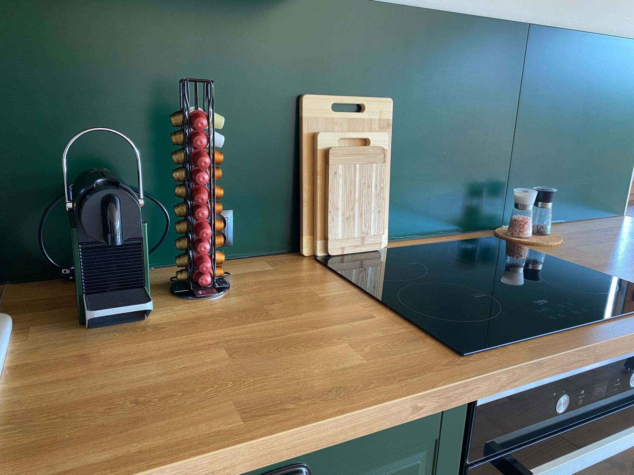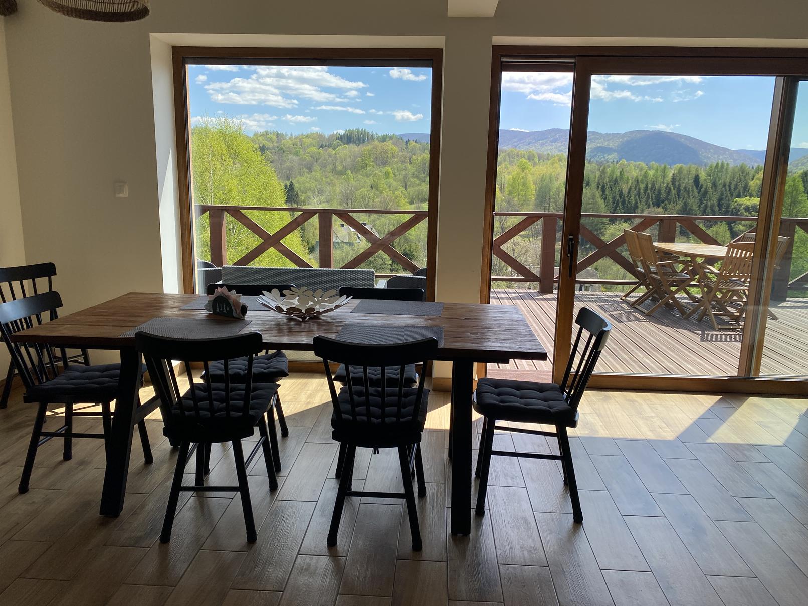 stół, w pełni wyposażona kuchnia (kuchenka mikrofalowa, piekarnik, zmywarka, mikser) oraz telewizor.