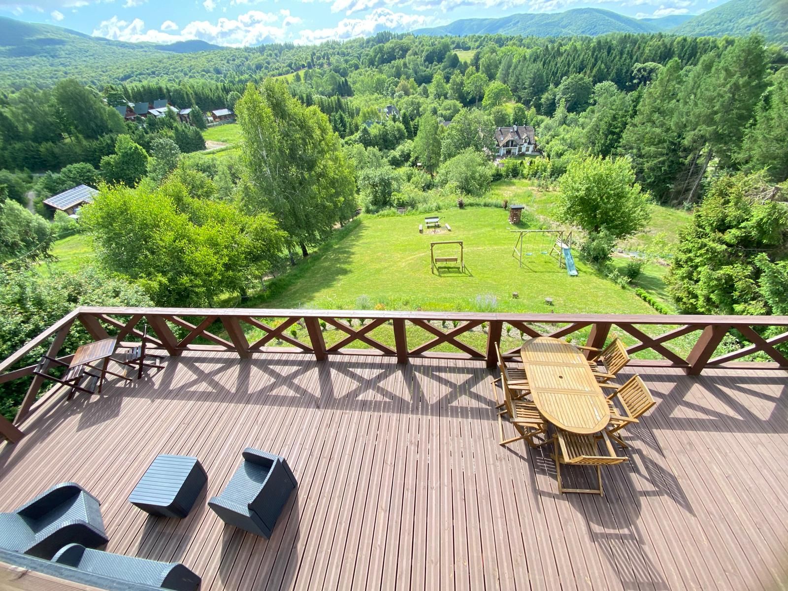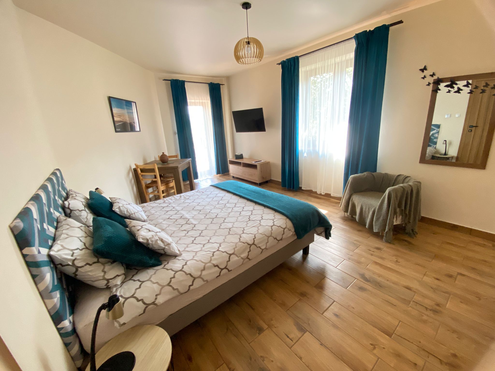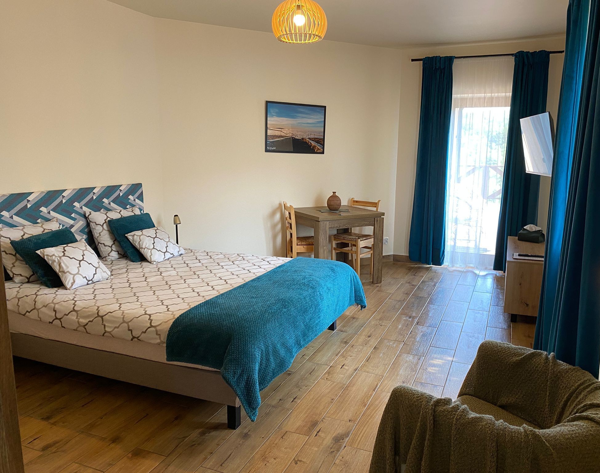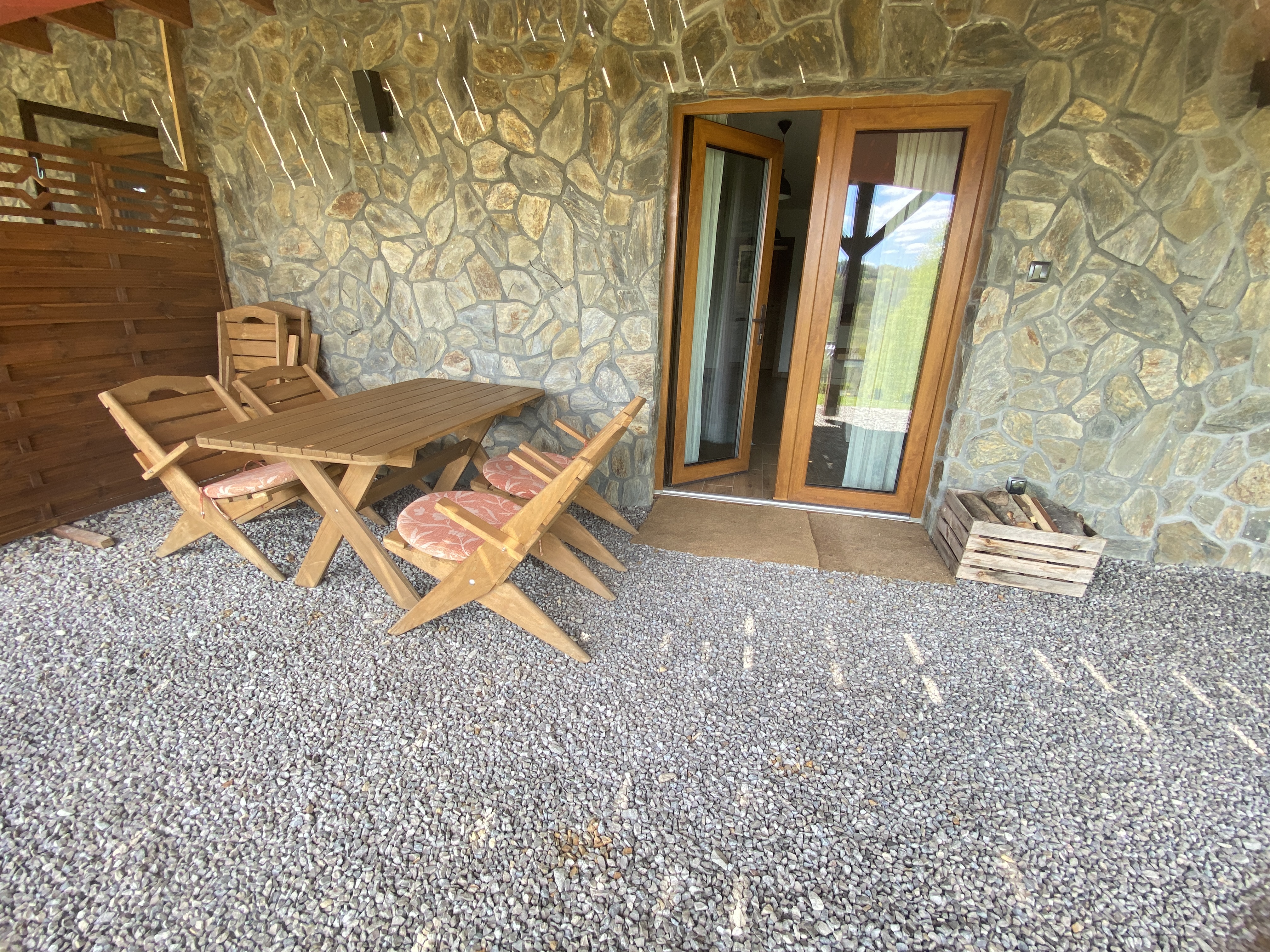 Pokój z wyjściem bocznym na główny taras, z własnym miejscem do wypoczynku.