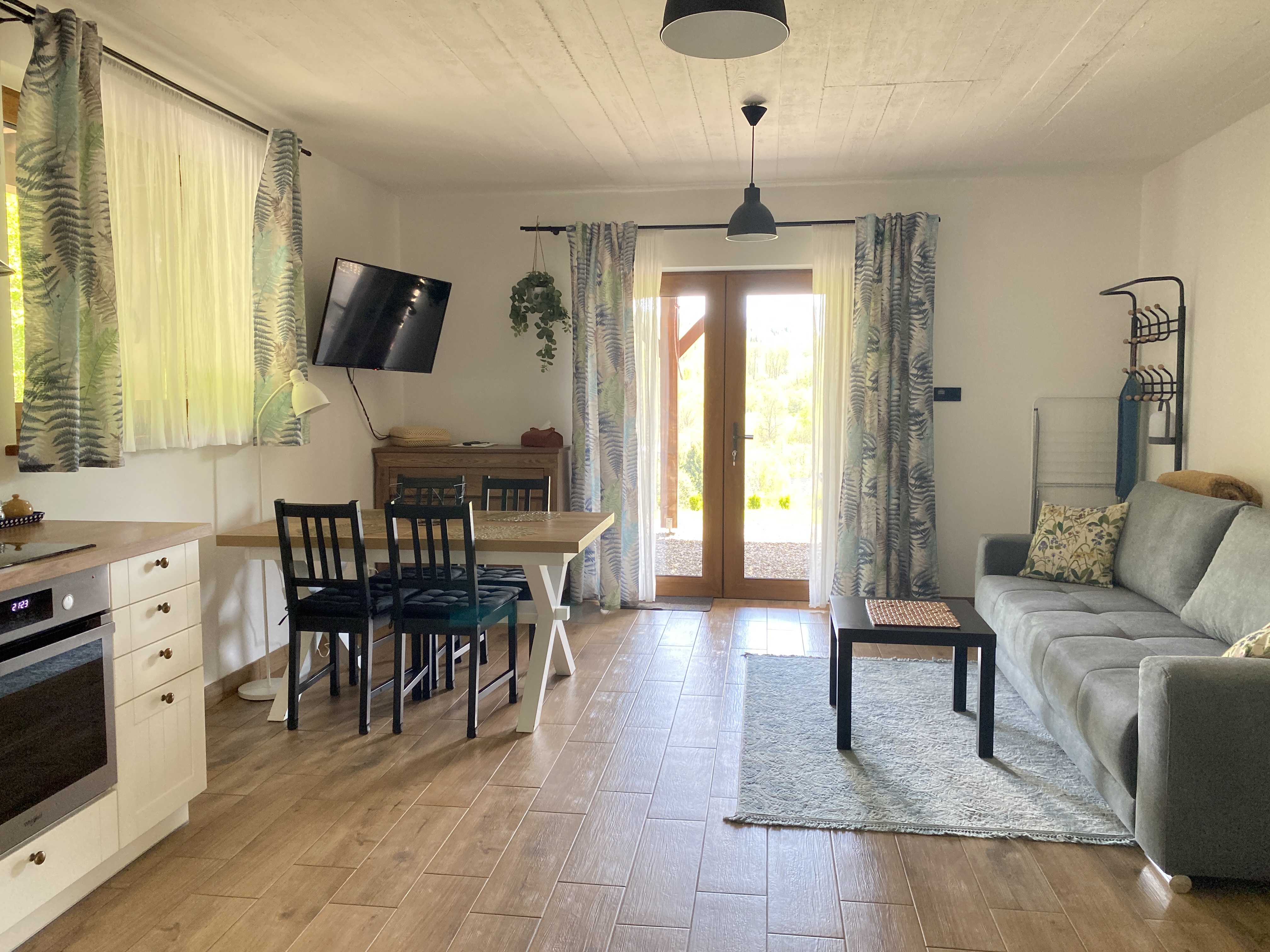 W jego skład wchodzi pokój dzienny z kuchnią, sypialna oraz łazienka wyposażona w suszarkę do włosów i ręczniki.