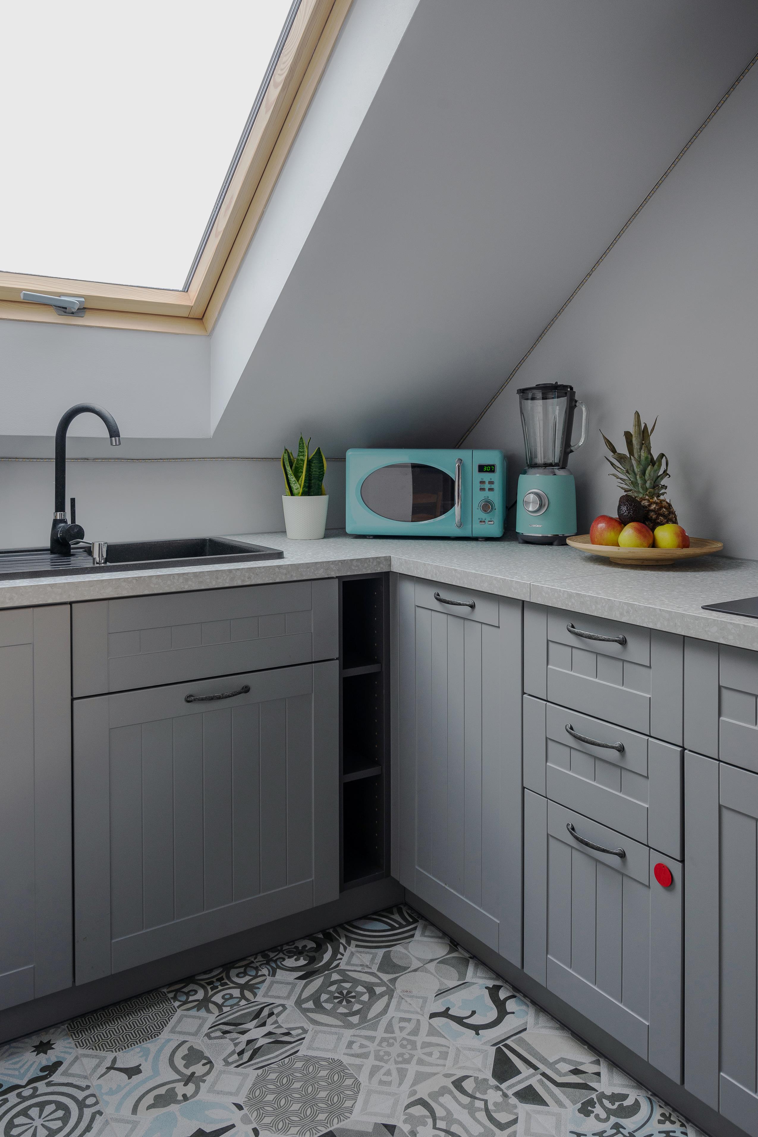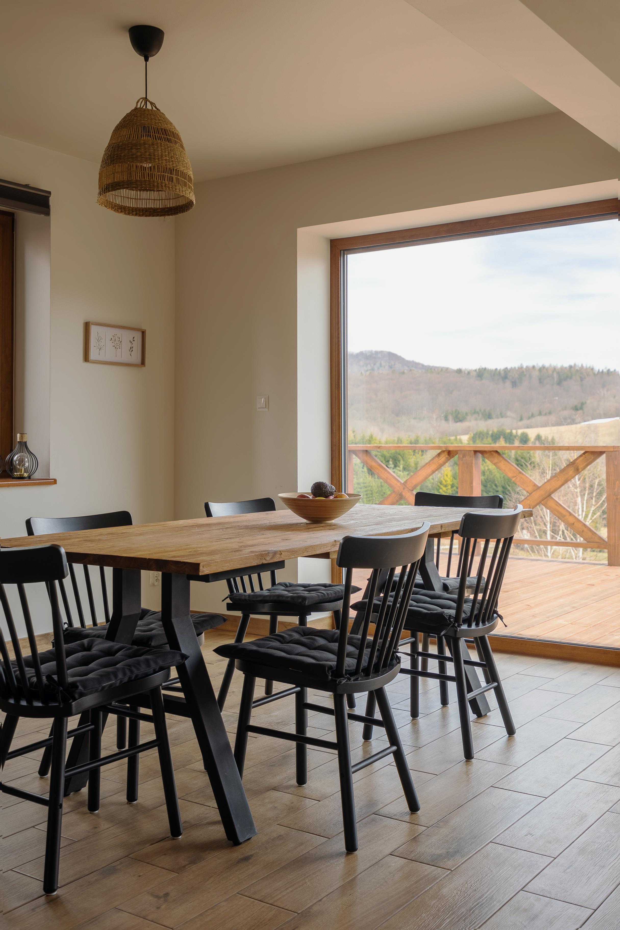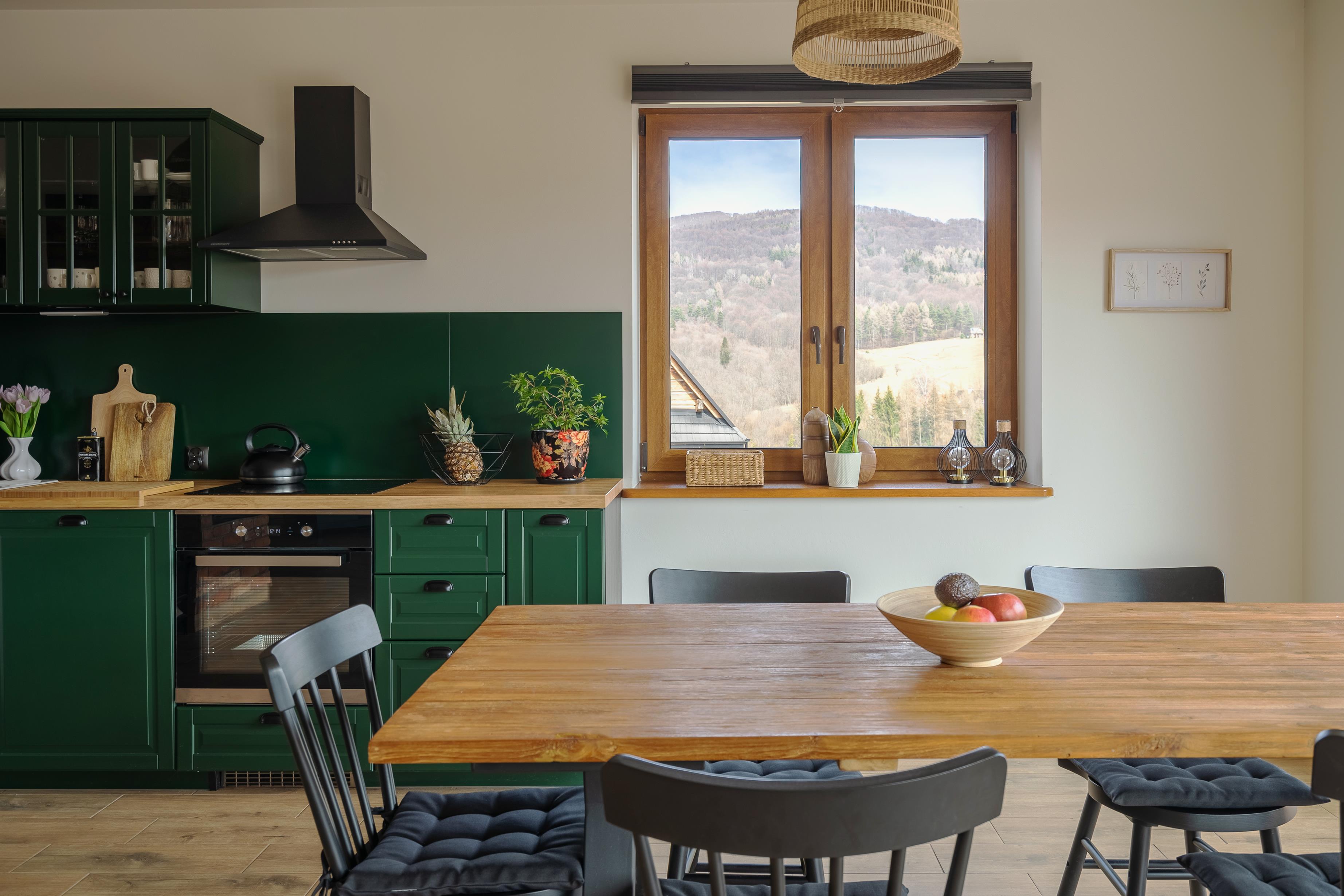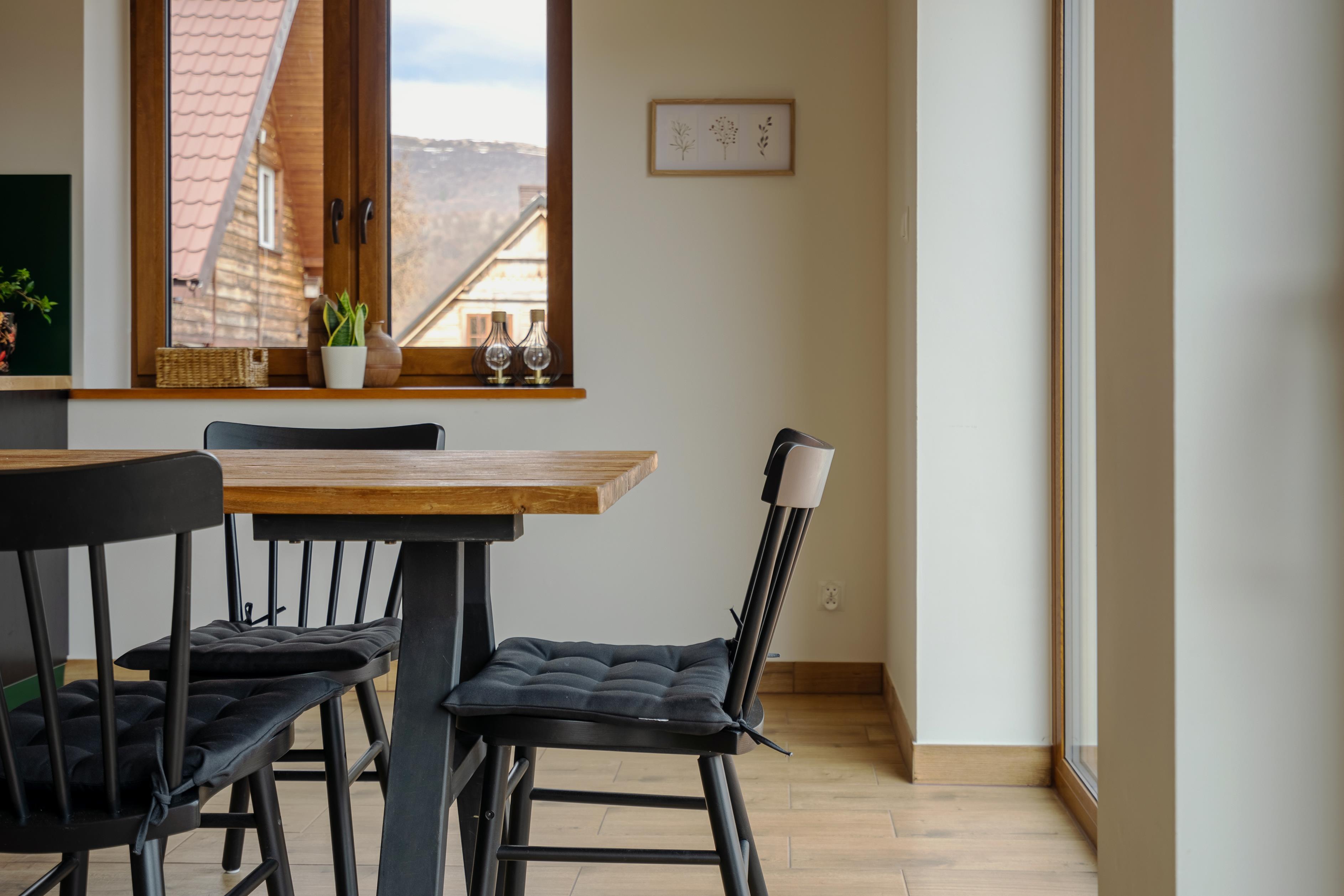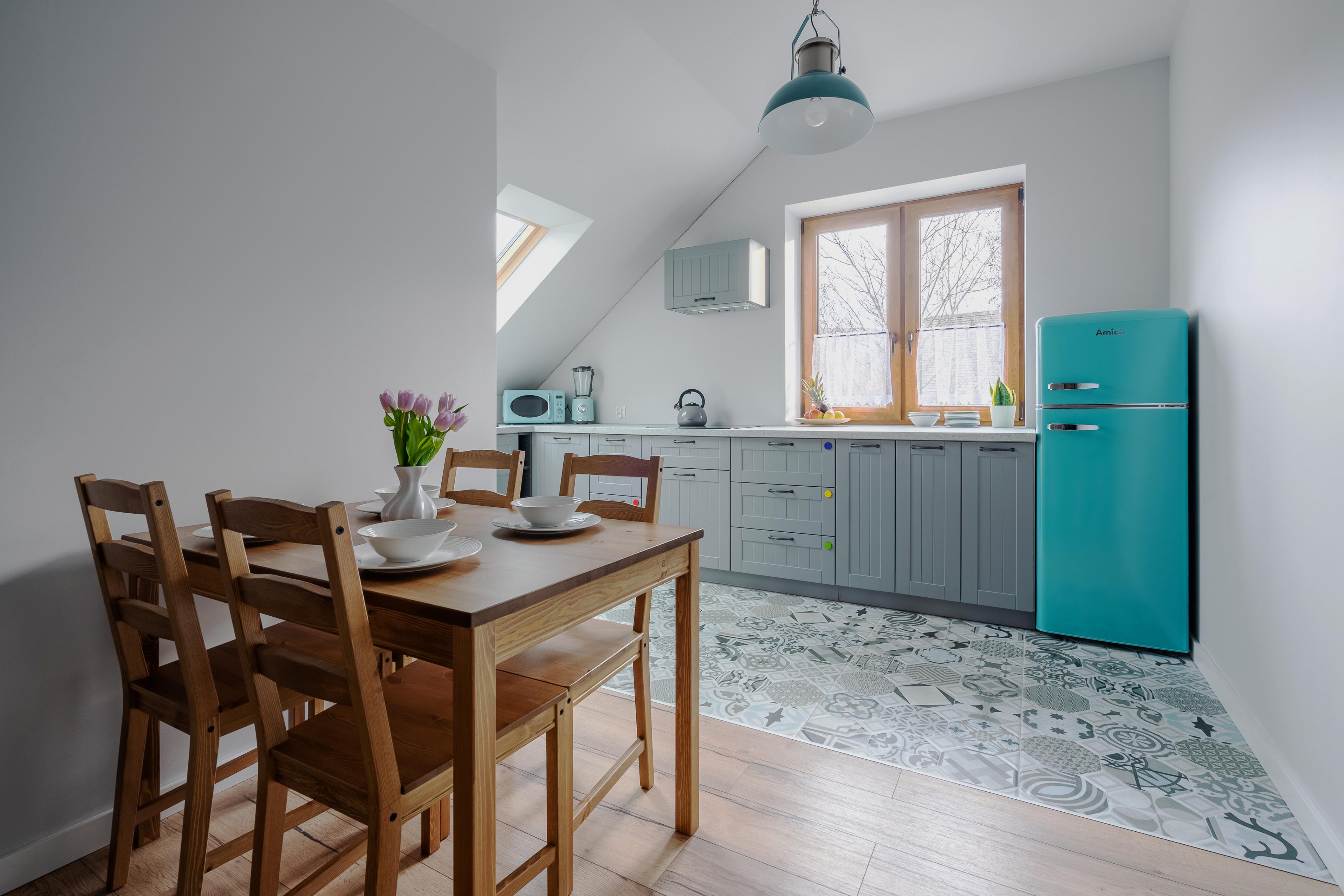 stół, w pełni wyposażona kuchnia (kuchenka mikrofalowa, piekarnik, zmywarka, mikser) oraz telewizor.